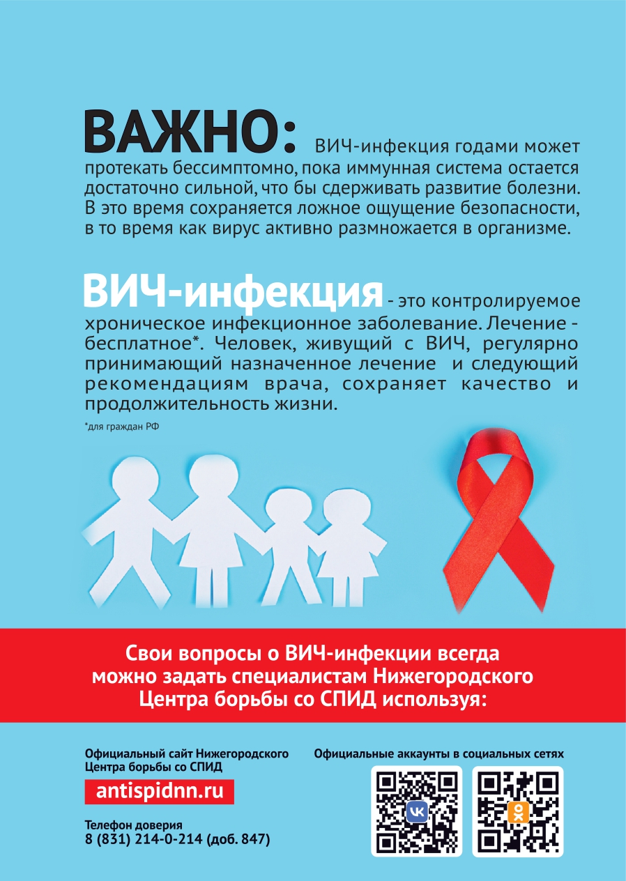 В России для этого делается очень много: от проведения информационных кампаний, разъясняющих, где и как сдать бесплатный тест на ВИЧ-инфекцию, и что делать, если результат оказался положительным, до бесплатного лечения ВИЧ-инфекции.